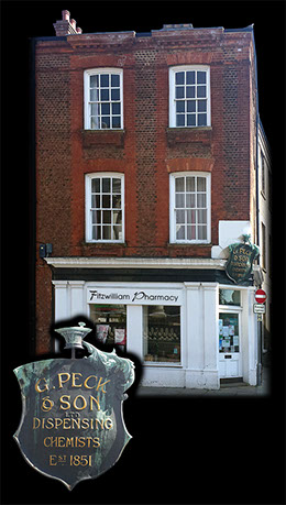 Born in 1866 in Cambridge, he was the son of George and Edith Peck, of Fitzwilliam Street. After attending the city’s Perse School, he followed in his chemist father’s footsteps by becoming an apprentice in the family pharmacy in Trumpington Street. He went on to study pharmaceutical chemistry and at Fitzwilliam Hall, Cambridge, and gained a BA in 1894 and an MA in 1897. He was also appointed an examiner for the British Pharmaceutical Society in 1899.